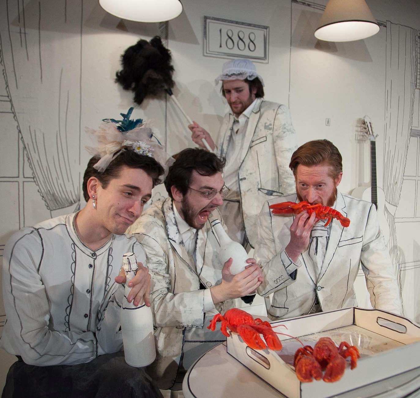 But it’s Jordan Mallory Skinner with his excellent portrayal of Pooter’s long suffering wife, Carrie, who gives a clear sense of the difference between Pooter’s diary and the reality of his life. His quiet, still performance shows Carrie grimacing through Pooter’s buffooneries until she is pushed too far and becomes a storming ferocity on stage. Indeed the whole cast are a dab hand at farce and their fast-paced acting builds up to some very comical- and very ridiculous- moments. And, while they are clearly talented, the onslaught of silliness is a bit unrelenting at times, and it might have good to see a fuller range of tones in this piece. After all, George is a pitiful character and giving the audience a chance to feel this would have only increased the humour, in contrast.