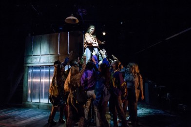 The play begins in an intriguing fashion, with the shadow of a character lurking on stage as the audience take their seats, and contemporary footage of violence and political headlines splayed across the stage on a makeshift screen. It’s a real shame that this screen isn’t utilised more throughout the show, as it brings an engaging element to what is otherwise a dialogue heavy and spaciously frantic show. With a cast of thirteen, obvious individual talent has little space to shine, and the narrative is difficult to track at times due to lack of character development and multiple personalities embodied by the same person. Despite this, Landmines is by no means 80 minutes of chaos, and there are moments of pure tension, intelligent exploration and fierce confrontation of today’s world through a fictional lens, set against the backdrop of a murder strikingly similar to that of Jo Cox.