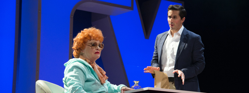 All the same, I was looking forward to being enlightened about her life, her background, her shows, and her sense of humour, and waited with diminishing patience for this to begin. This play is a simple two hander which benefits from an extraordinary performance from Sandra Dickinson, portraying the famous woman with complete conviction, and from a somewhat more quotidian one from Matthew Scott, playing her star-struck young admirer, Lee Tannen. It suffers, however, from some serious faults which should have caused its backers to reflect long before it reached the stage. First, there is no drama. There are short, fairly dull accounts of already dull events – the time when she was spontaneously applauded at a production of La Cage Aux Folles, and took a bow in the spotlight, for example – but for the most part the ‘action’ consists of the two characters name-dropping over a game of backgammon, while quaffing cocktails. If you are impressed by celebrity and fame for their own sakes, and love hearing the name ‘Cary Grant’ breathed, if you long to visit Beverly Hills simply to look at forbidding gates and dream about the star rumoured to live just the other side, you might enjoy this, but I’m betting that most theatre-goers want more. The row that arises between them at the end of the first act is transparently merely a device to get us to the interval.