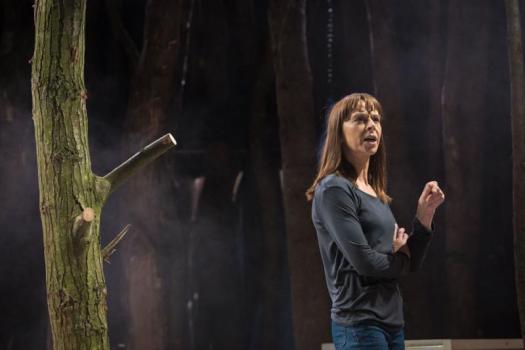 If the war is seen from a female perspective, Vorozhbit’s text does not cut short the male experience of war. Women do not suffer at the hands of men; they suffer because of the war, and the even the most horrific moments in the play- when a man abuses a woman he has taken hostage- there is no sense of a gendered battle, simply humans damaged by war. The audience is tightly packed into the space in the Jerwood Upstairs and we are bought so very close to the excruciating action on stage; it is a feat of directing that Vicky Featherstone manages to transport us along this road of war with minimal changes to the set. A simple design of ice-encrusted trees fill the space and the characters stand amongst them to deliver their lines to one another. Foregoing the need to represent a car or a bench, this production is purposefully stripped backed to reveal the full savagery of war and the brilliance of the cast’s performance.