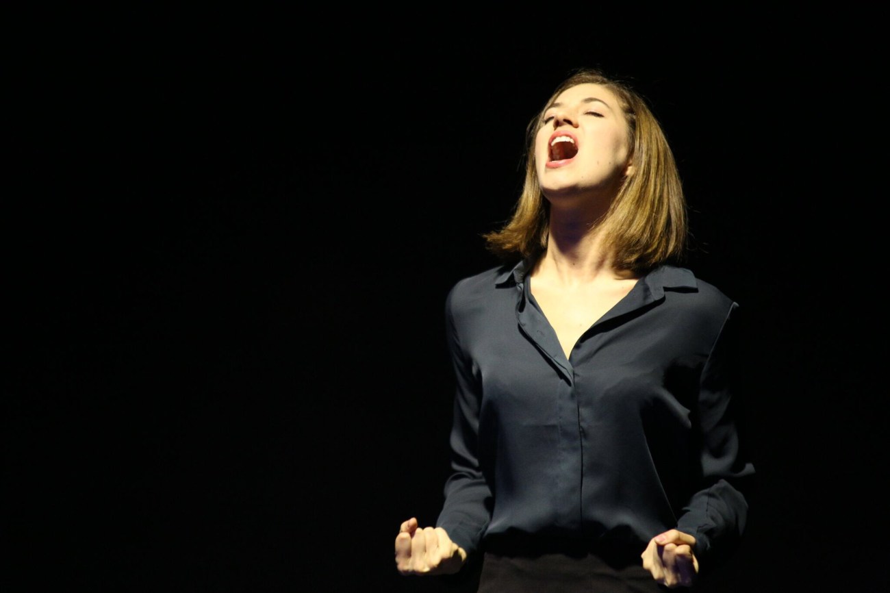 ‘The Sensemaker’ is basically unclassifiable. It is a one woman show, the concept, choreography and performance are by Elsa Couvreur of the Swiss-based Woman’s Move dance collective. It does, however, feature an outstanding contribution from the voice responsible for all the recorded messages. It ranges from the hilariously funny to the toe-curlingly embarrassing and the downright disturbing. It is at once a celebration of the madcap absurdity of a continent containing more than 30 countries and probably twice as many languages as well as a grim reminder of the horrors wrought in this place when the laughter stops. It is a dance show in which the protagonist spends much of the time standing still. It is a piece of mime which can get very noisy indeed. It is both a dream and a nightmare.
