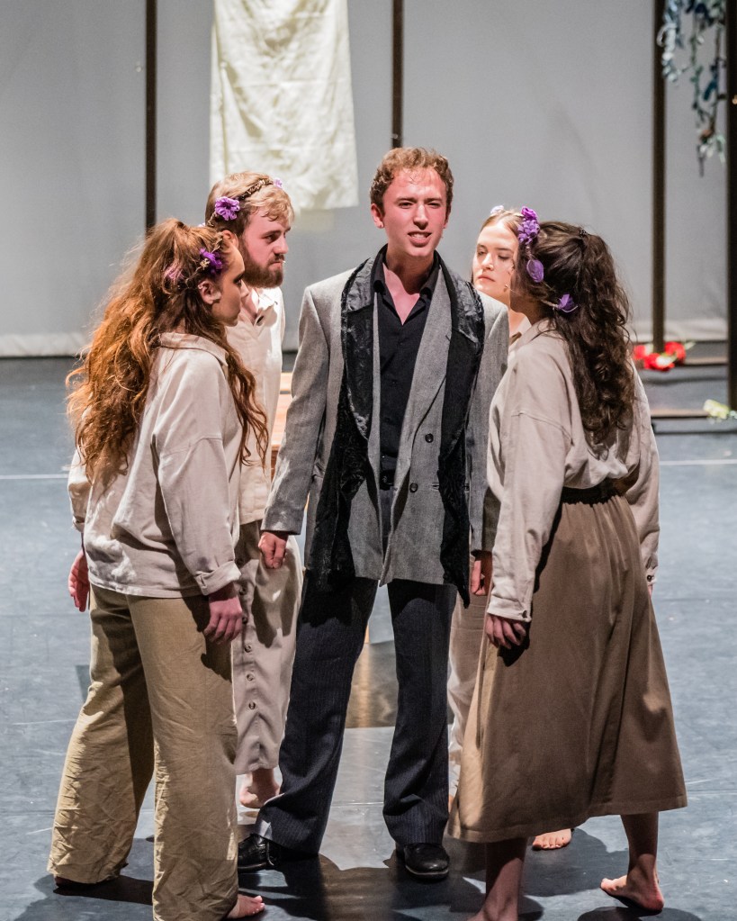 Persephone’s dalliance and disappearance causes problems to the gods, and Zeus (Lorcan Cudlip-Cook) in particular, when Demeter, goddess of the harvest, goes to find her, leaving famine in the land. He dispatches Hermes (Franco Lopez) to bring Persephone back from the Underworld to try to resolve the problem. When he does, Zeus, almost on a whim, to spite his brother, and because he can, rapes Persephone. This is handled rather well, and, in the most well-worked argument of the play, Persephone later rails against all those complicit in the crime, as well, of course, as Zeus himself.