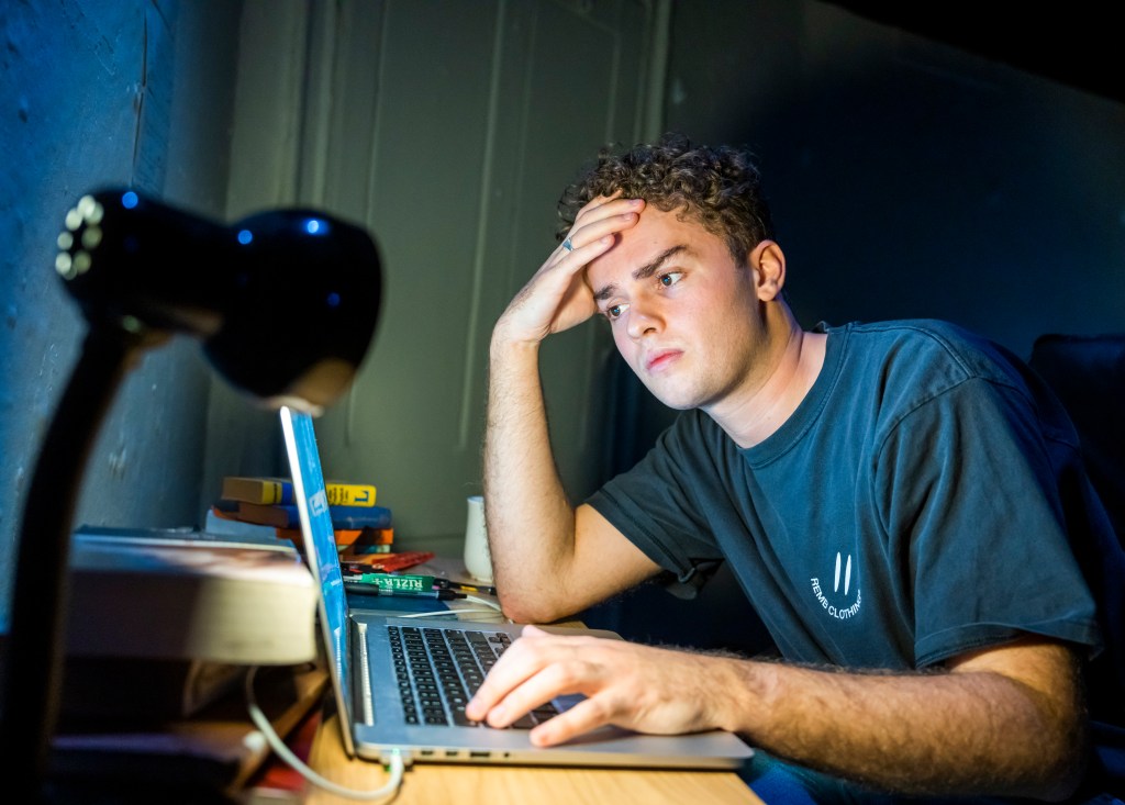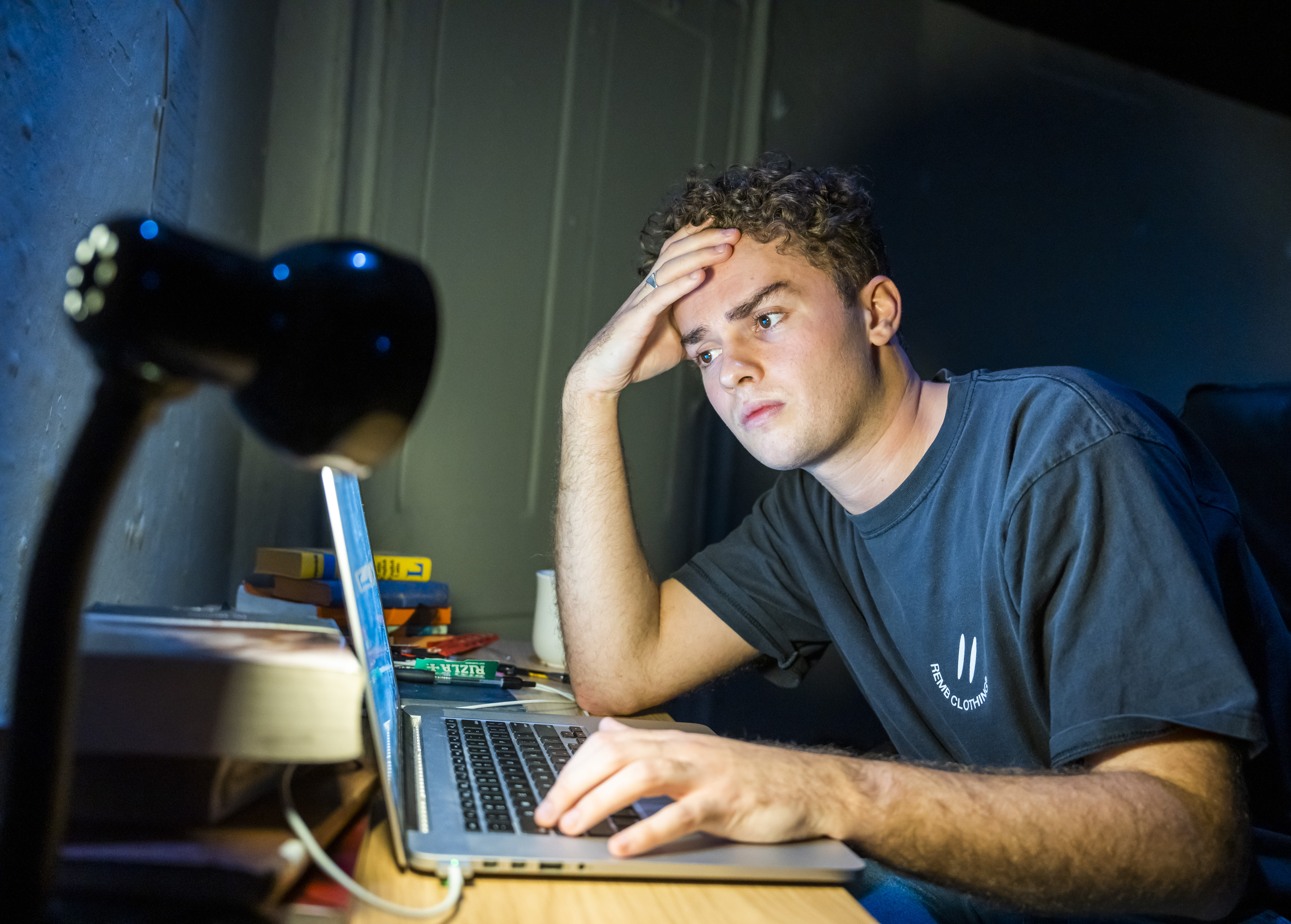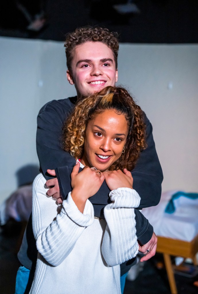 The play starts in a perfectly rendered room in a student hall of residence. This belongs to Simon (James Wilbraham), who is redoing his third year, after dropping out the year before. And this is the room into which he brings Mia (Amaia Naima Aguinaga), a first-year student whom he’s just met. Their awkward chat over a shared can of warm lager drew a shiver of embarrassed recognition from the audience – it is touching, at times completely hilarious and utterly heart-warming as they navigate the waters of attraction and shyness. And we cheer for them when they do get together.