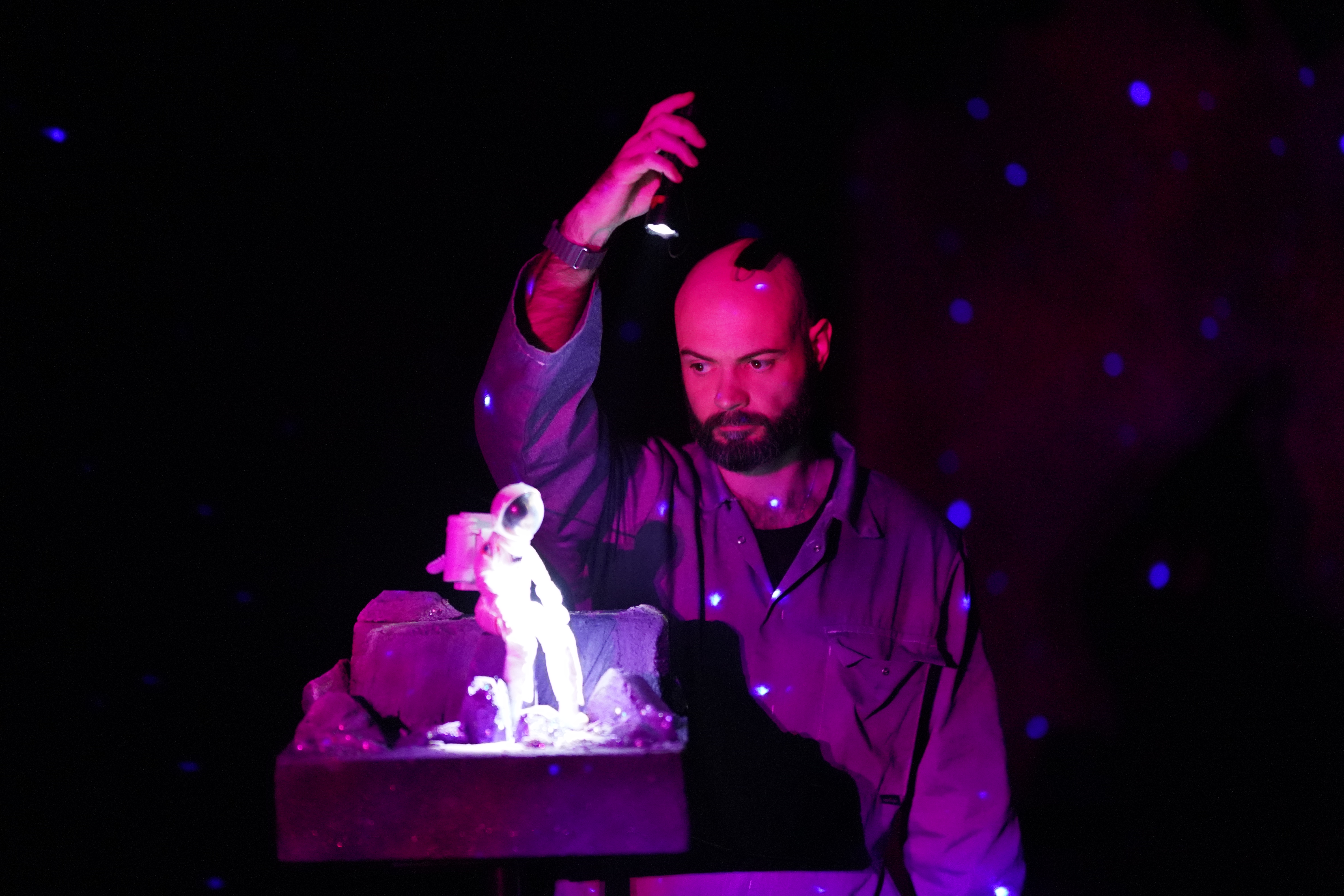 There are many moving moments in the story, but the puppetry scene to me was oustanding. So simple in execution but devastatingly powerful, it showed the magic that ‘analogue’ theatre-making can still possess in the midst of all the technological wizardry on display. A torch, a tiny model of an astronaut, a few almost imperceptible movements – unbearably touching, and breathtaking stagecraft.