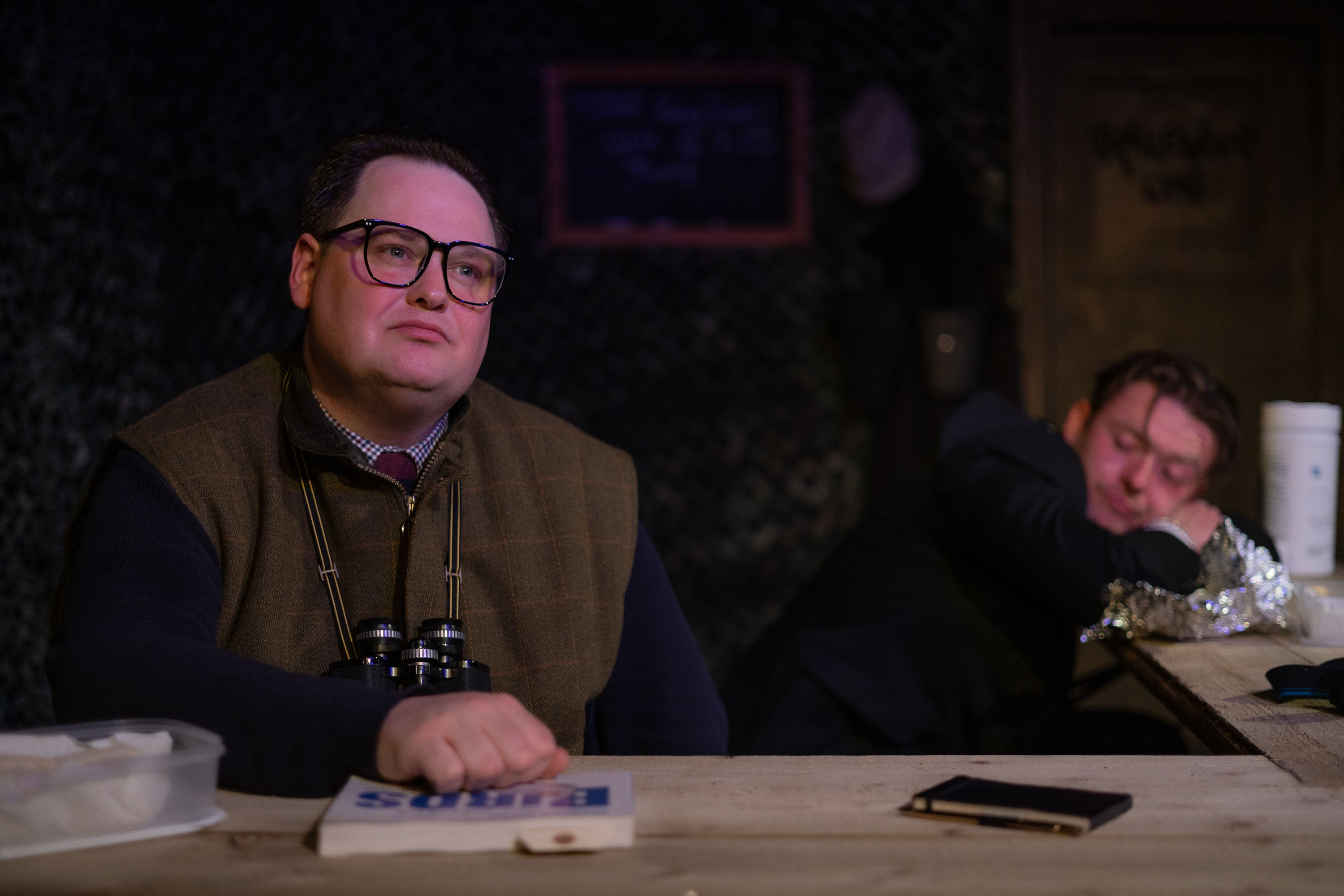 The grit in the oyster comes in the shape of an intruder (Calum Lill) who stumbles into the hide simply to get out of the storm. He rather unconvincingly calls himself Dave. We are immediately suspicious of him. His cover story makes no sense. He is clearly starving, and seems to have been wandering around for days. When a message comes through from the police on Roy’s walkie-talkie warning of a dangerous criminal on the loose our suspicions seem to be confirmed. Tension mounts as we wonder when Dave will make his move and how on earth Roy may be able to extract himself.