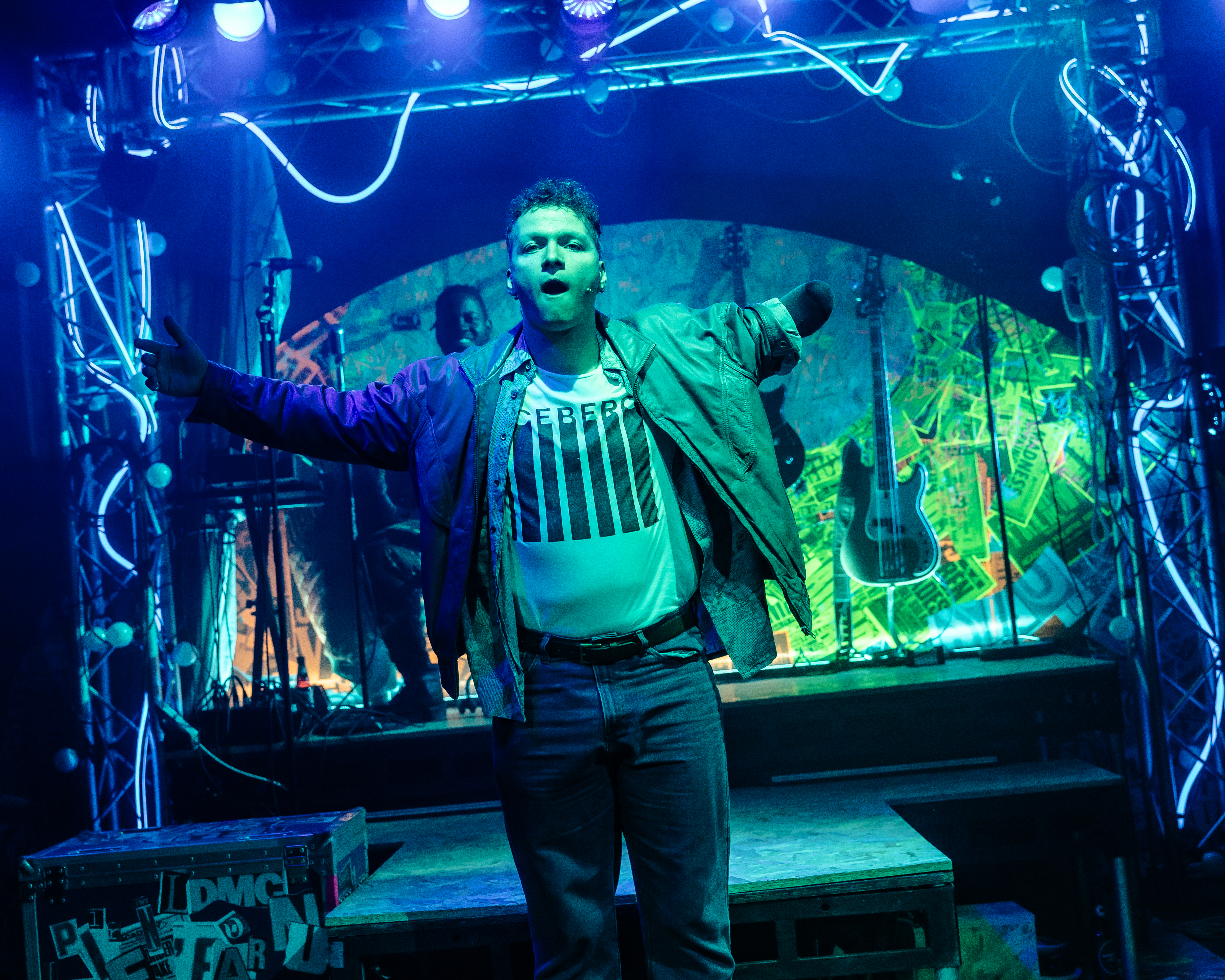 Just over ten years ago, Simon Parkes wrote his memoir Live At The Brixton Academy describing the incredible true story of how he acquired the lease on the building that would become the Brixton Academy for £1, before subsequently selling it on, over ten years later, for £2.5 million. Writer Alex Urwin and director Bronagh Lagan have turned this raw material into a raucous, wild and irreverent play, which immerses the audience in one of the best of those Academy nights. Set designer Nik Corrall has created a circular arrangement of lights in front of the stage, no doubt in homage to the Academy’s famous dome. Parkes himself is played by Max Runham, while his close collaborator Johnny Lawes is played by Tendai Humphrey Sitima. As well as telling the story, the pair rock out repeatedly through the course of the show as they relive some of the venue’s outstanding performances. Max Pappenheim manages the sound brilliantly – it rocks, but is never overwhelming.