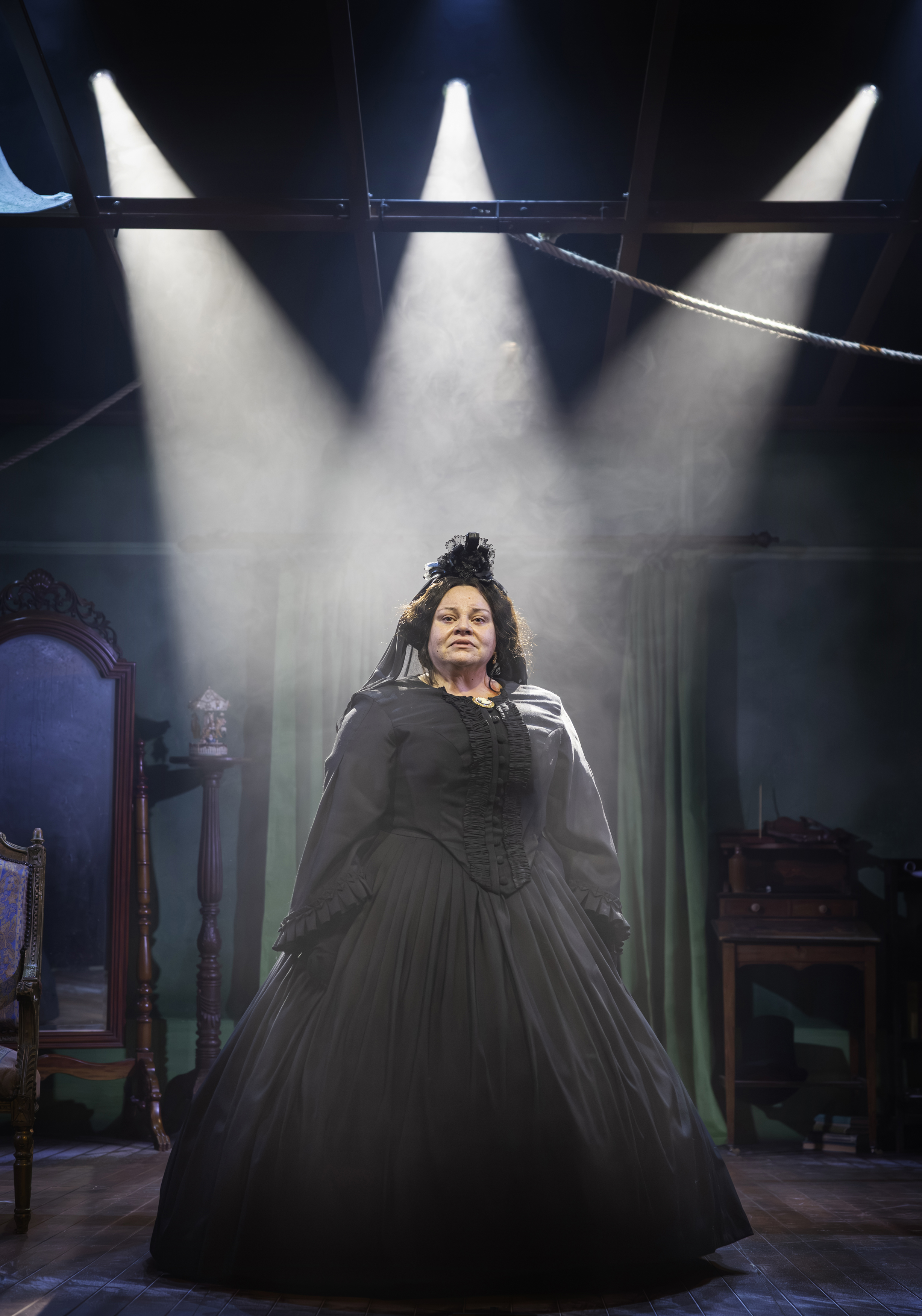 When Keala Settle makes her entrance as Mary Lincoln in John Ransom Phillips’s play, there is a momentary pause when she poses, framed and majestic, as though waiting for the applause with which a Broadway audience would greet a star of her stature. The applause never comes – welcome to London, Ms Settle. The Charing Cross Theatre nestles under the arches beneath the station, like a wartime retreat for Londoners suffering the rigours of the Blitz. It makes a fitting backdrop, too, for Anna Kelsey’s set – a mid-nineteenth century photographer’s studio full of the new-fangled apparatus designed to manufacture the miracle of an image taken directly from life. Yet, what Mrs. Lincoln really wants from photographer Matthew Brady (Hal Fowler) is a picture that will transform her in the eyes of the public and win them round to her virtues.