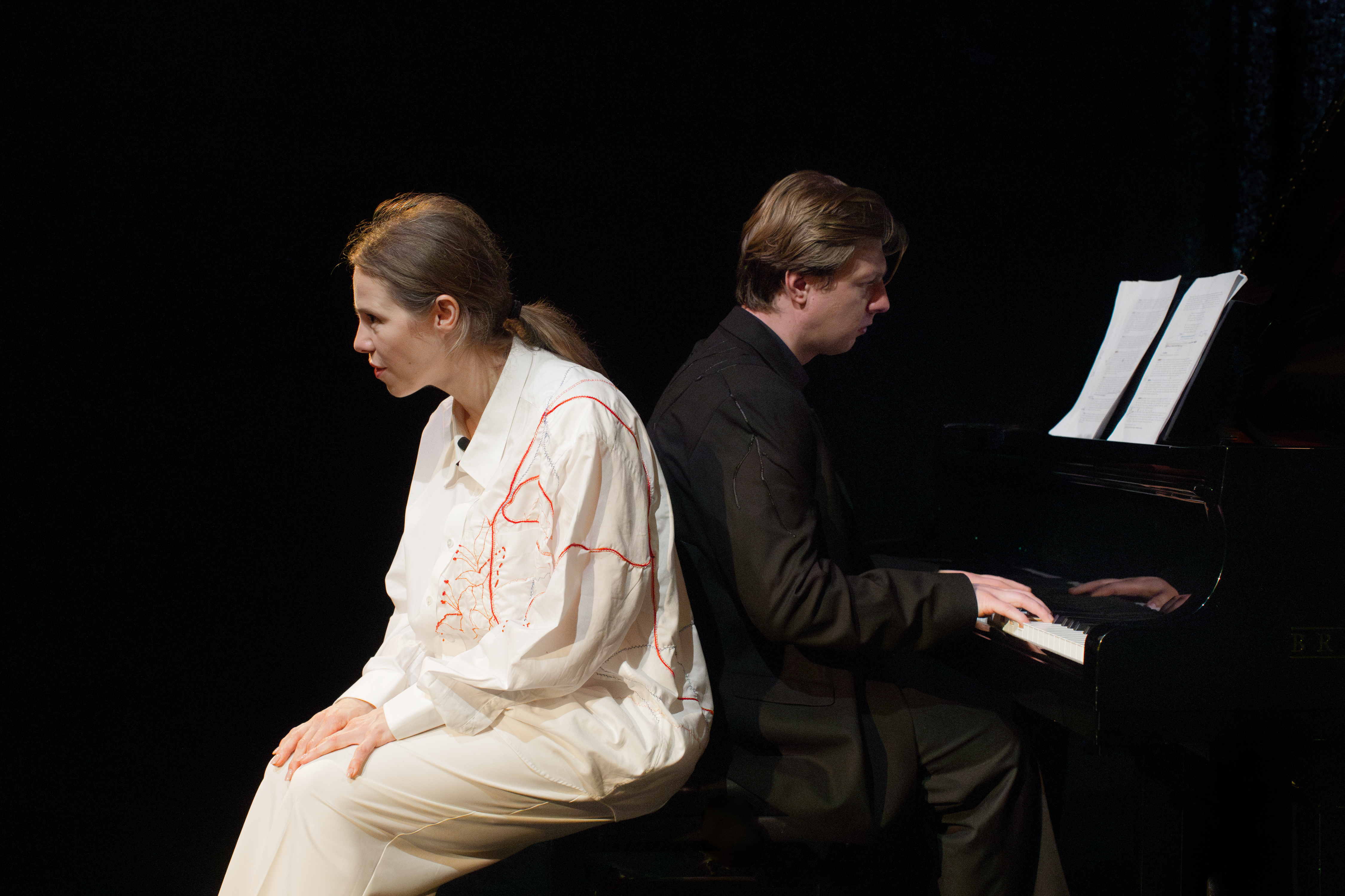 This is a very personal piece, written and performed by Yanina Hope with music written and played by Vladyslav Kuznetsov. Based on Hope’s relationship with her own father, it is staged as a series of vignettes, glimpses of scenes from her life with and without him, interspersed with snatches of poetry, movement and dance. Kuznetsov plays the piano throughout, as a kind of soundtrack and accompaniment – the intended effect is presumably to enhance our engagement with the spoken word, but for me there was little connection between the two. There is also extensive use of lighting effects provided by TheGeorgeNET, which again, did not seem to connect to either the music or the voice. The three separate elements failed to fuse into a satisfying whole. Directed in traverse by Ivanka Polchenko, Hope strides up and down, occasionally crouching and hiding as she tries to come to terms with her feelings. She is dressed all in white in a man’s dinner suit edged with what looked like veins and arteries which seem allude to her father’s role as a heart surgeon, but the significance remains obscure.