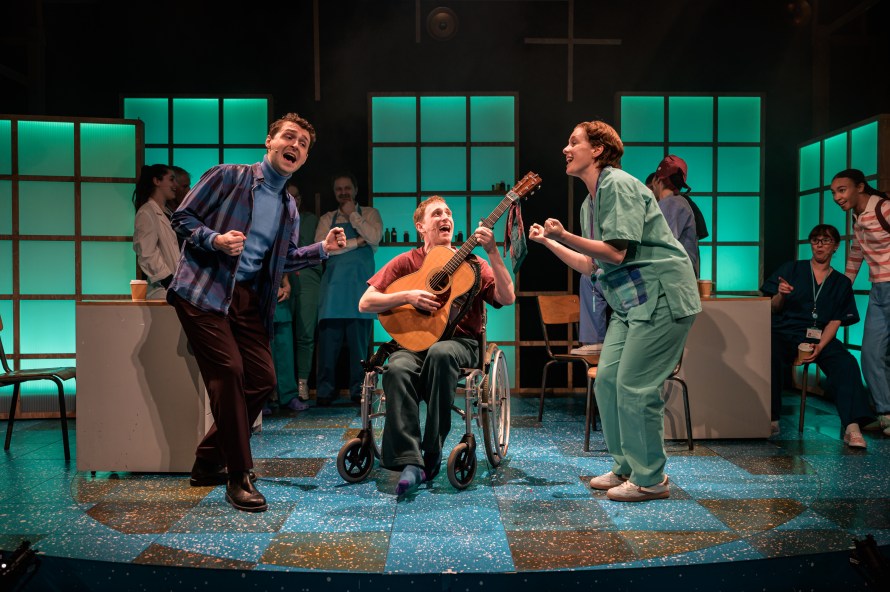 Interwoven with scenes from Fleming’s life is a story set today, where singer Aaron (Nathan Salstone) has collapsed on stage and ended up in the hospital where his ex, Jess (Maz McGinlay), is a paediatric doctor. Cue, awkward meet-cute, abetted by the third wheel in their friendship, Julian (Robbie Scott), who had been the bassist in their fledgling band. He is now a SPAD at Westminster, grappling with the challenges of finding the money that Jess points out is desperately needed. There are no easy answers here, but the problems are brought vividly to life.