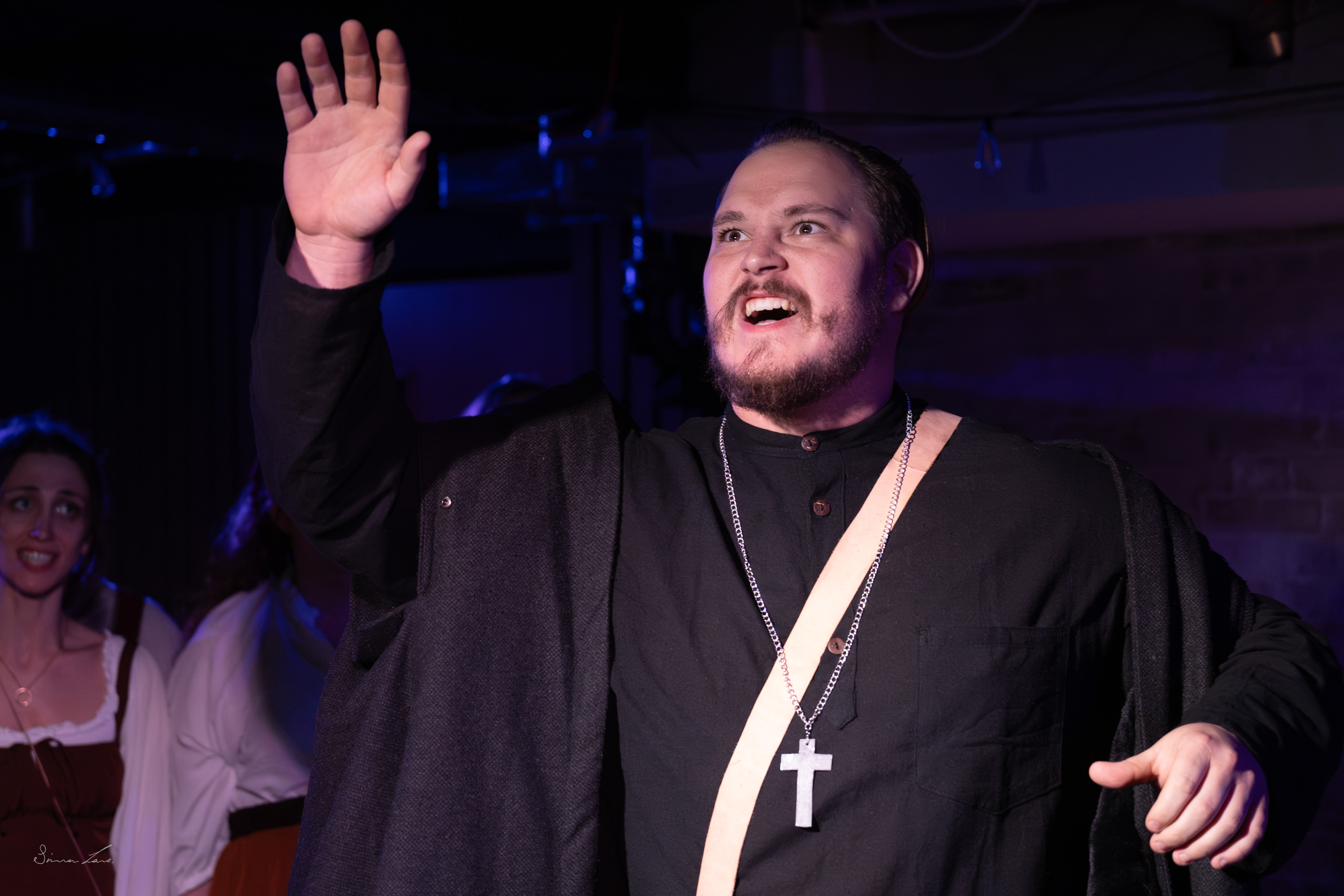 The play opens with an ensemble piece celebrating the life of its small town setting, where everyone looks out for each other and the worst thing that people get up to is gossip about who has been seen with whom. Social life centres around the inn run by widow Marion Walker (Roo Berry). But the tranquility of the town is set to be thrown into disarray by the arrival of black-cloaked witchfinder John Cowper (Dan Davison). His accomplice is a self-confessed witch, Margaret Aitken (Megan Farquhar), who has saved her own life by agreeing to ‘use her powers’ to identify other witches. The machinations that ensue leave no-one in the town untouched.